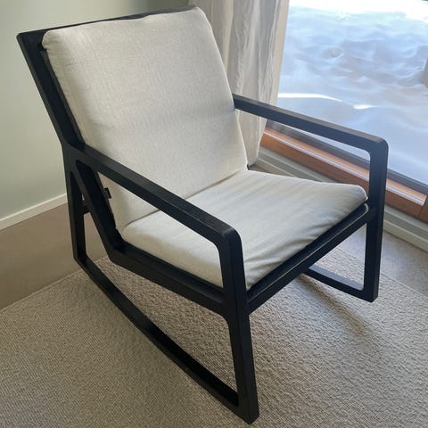 Vanha keinutuoli, ehjä ja toimiva, vaikka on ajan patinaa.