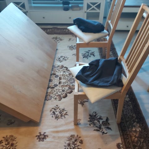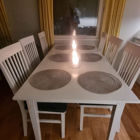 Sekä pöytä että tuolit ovat olleet useamman vuoden käytössä, joten kulumaa/naarmua/jälkeä löytyy jonkin verran. Tuoleista puuttuu muutama tiiviste/ruuvi istuimen alapuolelta, mutta tämä ei ole ainakaan meillä käyttöä suuremmin haitannut.