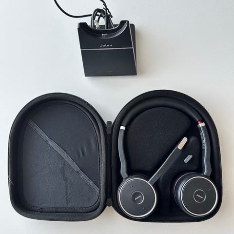 Lähes käyttämättömät Jabra Evolve2 75 langattomat kuulokkeet.
