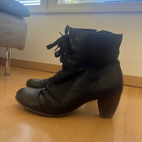 Bianco saappaat, koko 41. Väri musta. Nilkkapituiset varrelliset saappaat, joissa on sivuvetoketju pukemisen helpottamiseksi. Kengissä on paksu, voimakkaasti kuvioitu ulkopohja. Päällinen kevyesti kuvioitua nahkaa. Mukavat jalassa! Nouto Helsingin keskusta tai Lauttasaari.