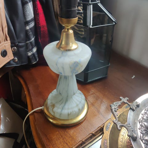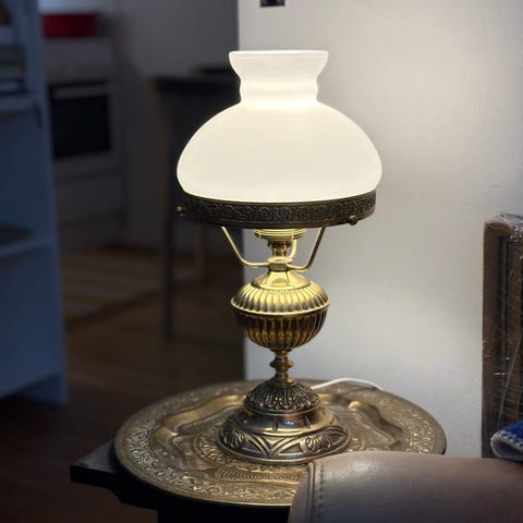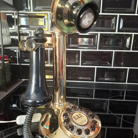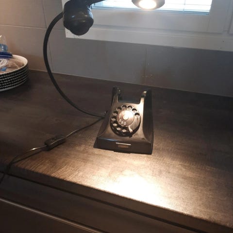Vanhasta puhelimesta tehty pöytävalaisin väri musta ja liloja koriste kuvioita. Valaisimessa ruskea lasi kupu. Virta painike upotettu kylkeen puhelimeen. Nykyaikainen pistoke. Lamppu E14 kanta.