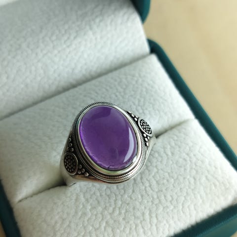Iso kivi ametistia, sormus 14k kultaa (585 merkintä löytyy). Sormus hyväkuntoinen, sisäosassa kaiverrus "18.4.63". Sormuksen koko on n. 17.5mm.