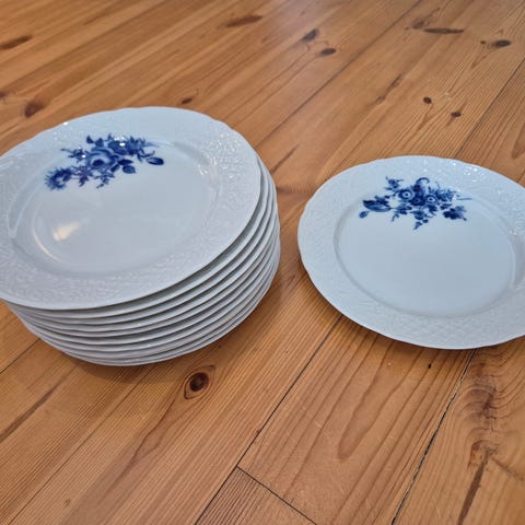 Lautasessa on kohokuvioinen reunus ja käsin litografoitu sininen kukkakuvio.
