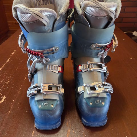 Tecnica laskettelumonot, koko 23.0 (mondopoint), pohjan pituus 274 mm. Väri valko-musta-punainen. Monossa useita solkia istuvuuden säätöön ja tukeva varsi. Soveltuu lasketteluun rinteissä.