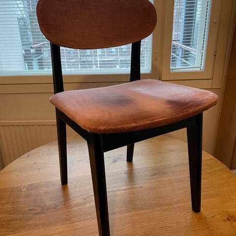 Ruskea keinonahkainen tuoli, mustat puujalat.