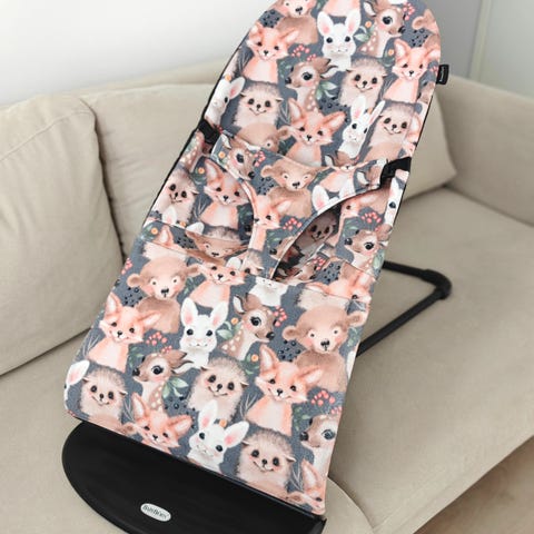 Baby björn sitteri joikusta tilatulla päällisellä. Mukaan saa myös sitterin alkuperäisen beigen kankaan, jossa muutama reikä, mutta toimiva edelleen.