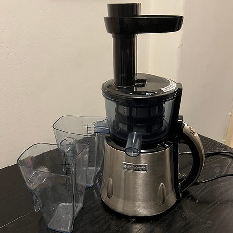 Huromin mehustin, tarkka malli HH-DBE11. Vuosia ollut (satunnaisessa) käytössä ja ottanut osumaakin mutta edelleen täysin käyttökelpoinen. Suosittelen lähteä testaamaan tällä jos kiinnostaa slow juicer.