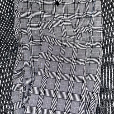 Uudet miesten tumman harmaat housut vyötärönauhalla. Lahkeissa laskos.