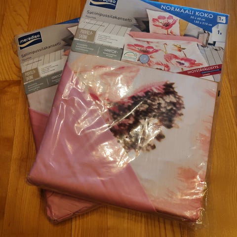 Uudet paketissa olevat Luhta Home satiinipussilakanasetti Piano sekä lisäksi 2kpl tyynyliinoja.