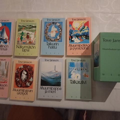 Ostetaan kuvan painoksen mukaiset kovakantiset versiot Tove Janssonin kirjoista Taikatalvi, Näkymätön lapsi ja muita kertomuksia sekä Muumilaakson marraskuu.