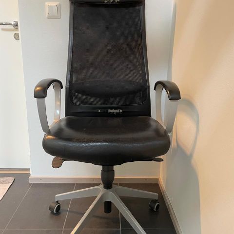 Ikean työtuoli, jossa 5 pyörää. Istuinosassa pieni tahra. Selkänoja verkkokangasta. Korkeussäädettävä.