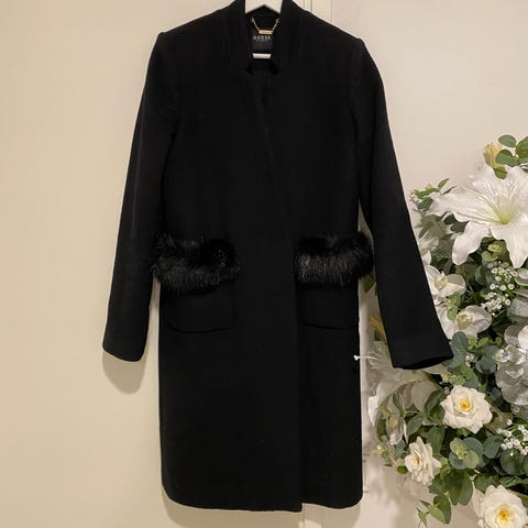 Guess villakangastakki naisille, koko S. Musta, polvipituinen malli, jossa leveä kauluskäänne ja kaksirivinen napitus edessä. Takissa on koristeelliset metallinapit taskujen kohdalla. Materiaalina villaseos, vuorillinen sisäpuoli. Sopii käytettäväksi arki- ja siistimpänä päällystakkina viileämpiin säihin.