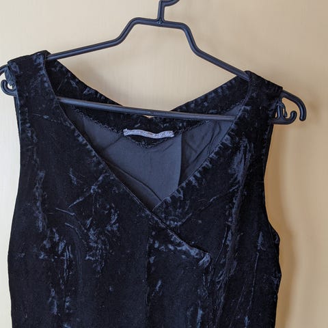 Musta samettimekko 30-luvulta. Melkein satavuotias vintagemekko on hyväkuntoinen ja ehjä. Aikansa mukaisesti mekossa ei ole vetoketjuja vaan niskassa ja vyötäröllä nappikiinnitys. Irrotettava punainen vyö on laitettu mekkoon myöhemmin, ehkä 70-luvulla. Pienikokoinen, arviolta XS.