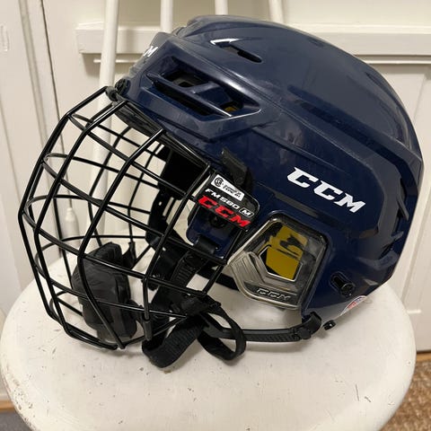 CCM jääkiekkokypärä, jossa irrotettava metallinen kasvosuojaritilä ja leukasuoja. Kypärä on valkoinen ja siinä on säädettävä leukahihna. Sisäpuolella on pehmusteet ja ilmanvaihtoaukot. Soveltuu jääkiekkokäyttöön kasvosuojalla pelattaessa. Kypärä ollut vähäisessä käytössä. Vain nouto Raision Kaanaasta.