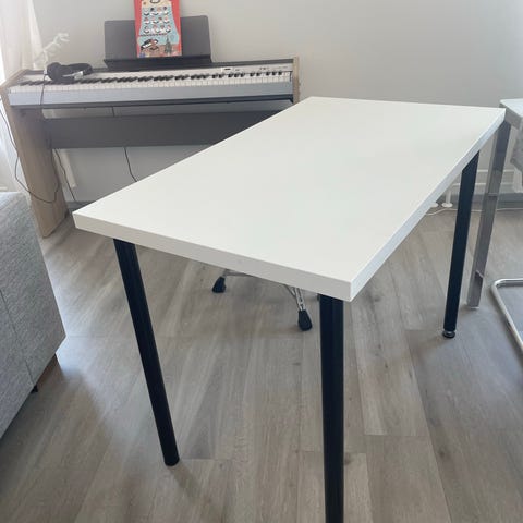 Muutaman vuoden vanha Ikeasta ostettu Linnmon/ Olov työpöytä kombo veivattavilla jaloilla, joilla pystyy hyvin säätämään pöydän korkeutta.