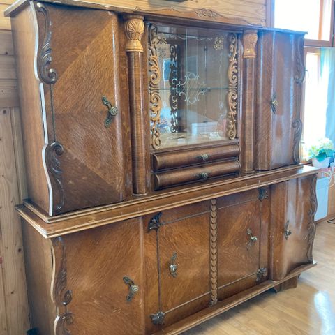 Vanha, puinen lipasto, jossa pieni kaappi hyllyllä.