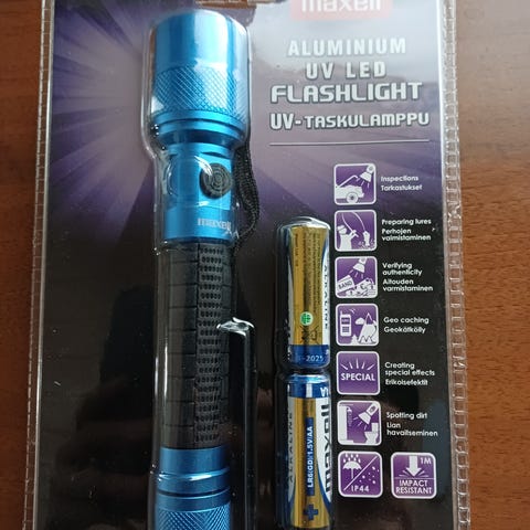 Taskulamppu, joka on valmistettu alumiinista ja jossa UV-valo. Se on iskunkestävä ja rakenne kestää pudotuksia jopa metrin korkeudesta. Taskulamppu saa virtaa kahdesta AA-paristosta.