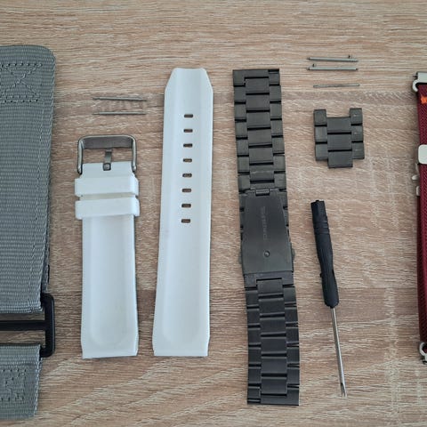 Yht. 7 ranneketta, mukaan varatappeja ja työkalu sekä punainen säilytyspussi.