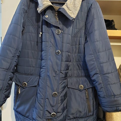 Lyhyehkö malli, hupussa ja helmassa kiristysnarut. Kahdet vetoketjutaskut, 1 rintatasku vetoketjulla. Kainalosta kainaloon n. 120 cm, olka-helma 66 cm.