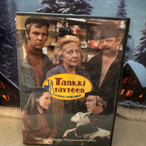 Tankki täyteen DVD-sarja. Suomalaista komediaa sisältävä kokoelma, jossa televisiosarja on julkaistu DVD-levyllä. Kotelossa kannet suomeksi, takakannessa sarjan esittelyteksti ja tiedot tuotannosta. Sopii katseltavaksi DVD-soittimella, joka tukee aluekoodia, joka on merkitty kotelon taakse.