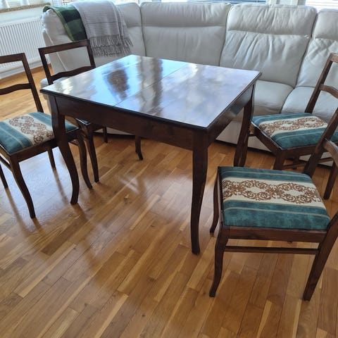 Runko oletettavasti koivua. Pöytälevy petsattua ja lakattua puuta (koivuviilu?)
