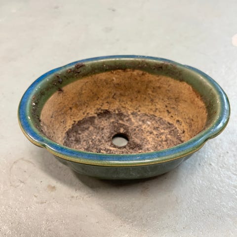 Bonsairuukku, jonka ulkopinta on tumma/sininen ja sisäpinta terrakotan värinen. Pohjassa on kaksi reikää, jotka helpottavat vedenpoistoa. Halkasija noin 10 cm.