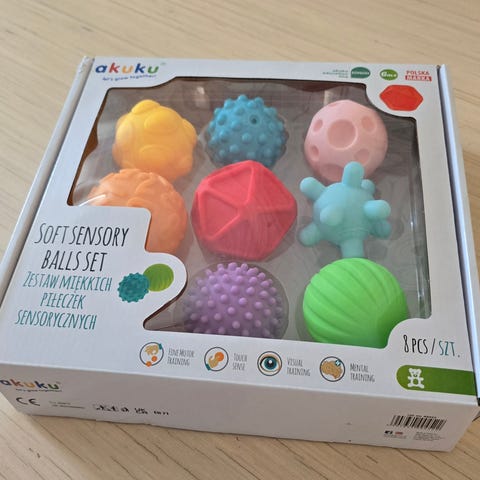 Myydään värikäs pallo vauvalle/taaperolle. Mukana pinottavat palikat, jotka saa pujotettua pallon sisälle. Pallon pinnassa erilaisia pintoja.