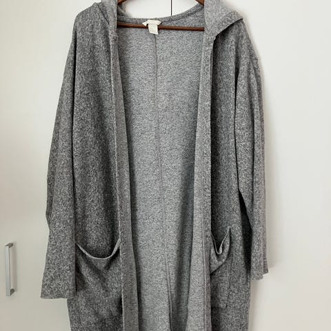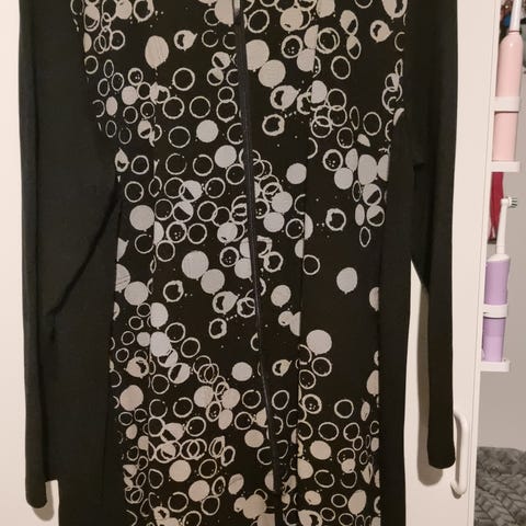 Neuletakki koossa XXL. Pitkähihainen malli, jossa V-pääntie. Neuletakki on musta ja siinä on valkoiset reunukset edessä nappikiinnityksen kohdalla. Sopii käytettäväksi arjessa esimerkiksi toppien tai puseroiden päällä.