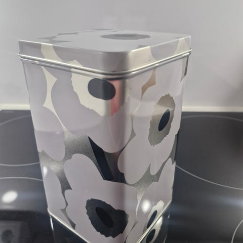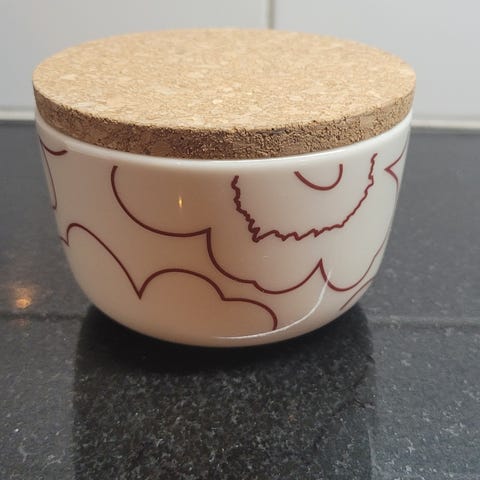 Marimekon Unikko-säilytyspurkki 2000-luvun alusta. Keraaminen, kansi muovia. Ehjä, muovikannessa hieman kulumaa.