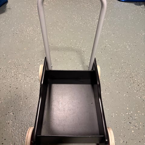 BRIO kävelyvaunu lapsille. Musta vaunu, jossa on harmaa työntöaisa ja neljä pyörää. Soveltuu pienten lasten kävelyn harjoitteluun ja leikkeihin, esimerkiksi lelujen kuljettamiseen. Materiaalina pääosin puu ja metalli muoviosin.
