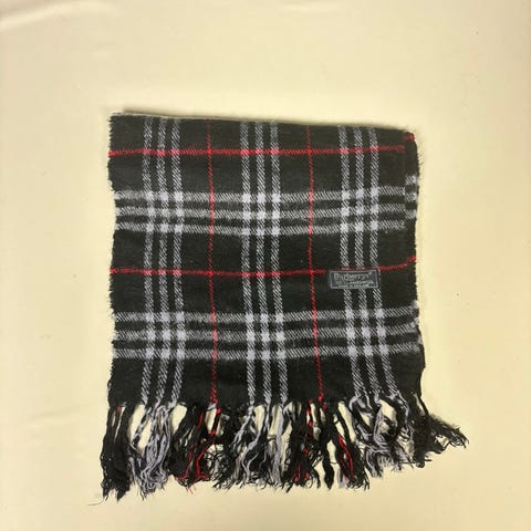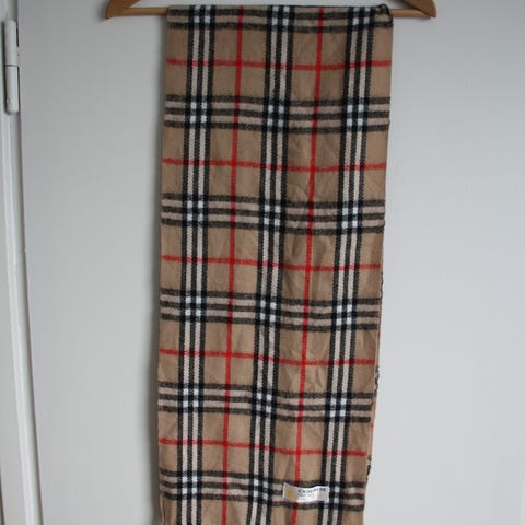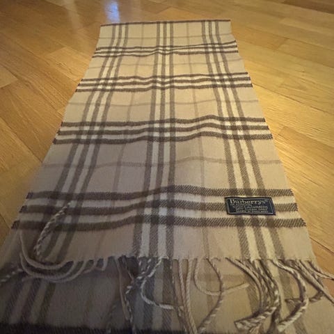 Burberry huivi, materiaali 100 % kashmiria. Vihreäpohjainen ruutukuosi, jossa valkoisia, mustia ja punaisia raitoja. Yksi koko, pitkä malli hapsuilla päissä. Sopii käytettäväksi esimerkiksi kaulahuivina arki- ja juhlapukeutumisessa. Hyvä kunto. 130 cm x 29 cm