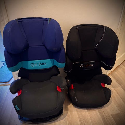 Kolaroimattomat istuimet, joista saa korokkeet. Menee 100-150 cm lapselle. Kankaita ei pesty eli myydään kuvien näyttämässä kunnossa.