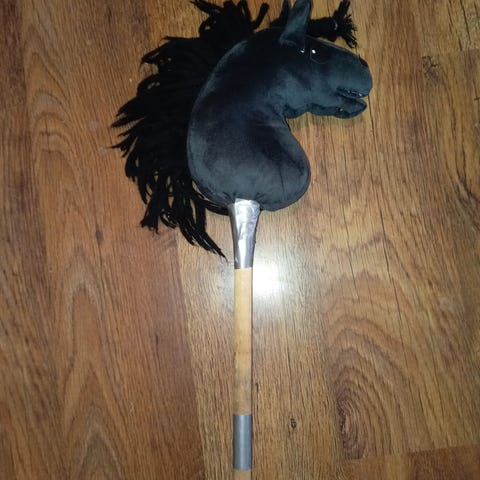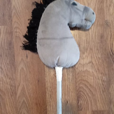 Hyväkuntoinen keppihevonen. Kankaassa näkyvät tummat kohdat ei ole likaa kuuluvat väritykseen.