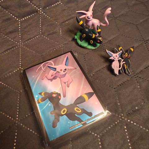 Pokemon Espeon ja Umbreon figuurit sekä Latios rintaneulat.