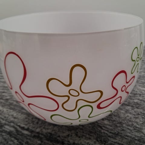 Kirkas lasikulho. Halkaisija 21cm, korkeus 14cm. Hinta 6€.