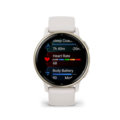 Älykello, jossa on AMOLED-näyttö, Garmin Pay, musiikki, GPS, yli 80 toimintaprofiilia ja paljon muuta. Halkaisija: 42,2 mm. Paino: 36 grammaa.Vívoactive 6 on suunniteltu heille, jotka haluavat älykellon, jossa on edistyksellisiä terveys- ja kuntoiluominaisuuksia. Siinä on kristallinkirkas 1,2 tuuman AMOLED-näyttö ja jopa 11 päivän akunkesto älykellotilassa, joten voit seurata yleiskuntoasi täysin vuorokauden ympäri.Saat paremman käsityksen kehosi energiatasoista Body™ - energiamittauksilla, jotka auttavat sinua tasapainottamaan liikunnan ja levon, unen, stressin, treenien ja muut asiat. Paranna unen laatua yksityiskohtaisilla unimittauksilla, pulssin vaihtelutilalla ja automaattisella päiväunien rekisteröinnillä.Vaihtelee treeniäsi yli 80 sisäänrakennetulla urheilusovelluksella, joihin kuuluvat juoksu, pyöräily, intensiivinen intervalliharjoittelu, golf, uinti ja liikkuvuusharjoittelu. Saat räätälöityjä päivittäisiä treeniehdotuksia ja voit käyttää edistyneitä treeniominaisuuksia, kuten liikunnan hyötyjä ja palautumisaikaa suorituskyvyn optimoimiseksi.Kun vívoactive 6 on yhdistetty älypuhelimeesi, voit vastaanottaa tekstiviestejä, sähköposteja ja älykkäitä ilmoitusta ranteeseesi. Sisäänrakennetulla musiikin tallennuksella voit ladata suosikkisoittolistoja Spotifysta tai Deezeristä (vaatii premium-tilauksen) ja kuunnella ilman puhelinta. Kontaktiton Garmin Pay -maksuratkaisu antaa sinulle vapauden maksaa liikkeellä ollessasi ilman että tarvitsee kaivaa lompakkoa esille.EDISTYNEET TREENIOMINAISUUDETTehosta treenikokemustasi räätälöidyillä harjoituksilla, liikunnan hyötyanalyysillä ja animoiduilla treeniohjeilla, jotka on tarkoitettu kestävyysharjoitteluun, joogaan, voimaharjoitteluun, korkean intensiteetin intervalliharjoitteluun ja pilatekseen.AKUNKESTOAkkukapasiteetti: Jopa 11 päivää älykellotilassa (5 päivää aina päällä -tilassa) ja jopa 21 tuntia GPS-tilassa, joten voit keskittyä liikkumiseen ilman lataushuolia.UNEN MITTAUS JA HYVINVOINNIN SEURANTASeuraa unen laatuasi unipisteiden, pulssin vaihtelutilan ja päiväunien rekisteröinnin avulla, jotta ymmärrät paremmin kehosi tarpeita. Kellossa on myös kattava hyvinvoinnin seuranta ranteen sykemittauksella, stressimittauksella, kuukautisseurannalla ja monilla muilla tavoilla.MULTISPORT JA GPSPidä kehosi liikkeessä yli 80 sisäänrakennetun treeniprofiilin ja GPS-pohjaisen liikunnan avulla, mukaan lukien patikointi, pyöräily, juoksu ja uinti.MUSIIKKI JA ÄLYKKÄÄT ILMOITUKSETTallenna suosikkimusiikkisi kelloosi ja kuuntele ilman puhelinta. Pysy ajan tasalla älykkäillä hälytyksillä puheluista, tekstiviesteistä ja sähköposteista, kun kello on yhdistetty yhteensopivaan älypuhelimeen.GARMIN PAY™Jätä lompakkosi kotiin ja maksa helposti kontaktittomalla Garmin Pay™ -maksuratkaisulla (tuetulla maa- ja maksuverkostolla).TEKNISET TIEDOT:- Koko (L x P x K): 42,2 x 42,2 x 10,9 mm- Kellon lasimateriaali: Corning® Gorilla® Glass 3- Kehyksen materiaali: Anodisoitu alumiini- Kansimateriaali: Kuituvahvistettu polymeeri- Näytön koko, L x K: 30,4 mm (1,2'') halkaisija- Näytön tarkkuus L x K: 390 x 390 pikseliä- Näyttö: AMOLED- Kellohihna: Sopii ranteisiin, joiden ympärysmitta on 125–190 mm- Paino: 36 g- Akun kesto: Älykellotila: jopa 11 päivää (5 päivää aina päällä -tilassa)- GNSS-tila ja GPS: jopa 21 tuntia- GNSS-tila kaikissa järjestelmissä: jopa 17 tuntia- GNSS-tila kaikissa järjestelmissä musiikin kanssa: jopa 8 tuntia- Muisti/historiatiedot: 8 Gt- Yht