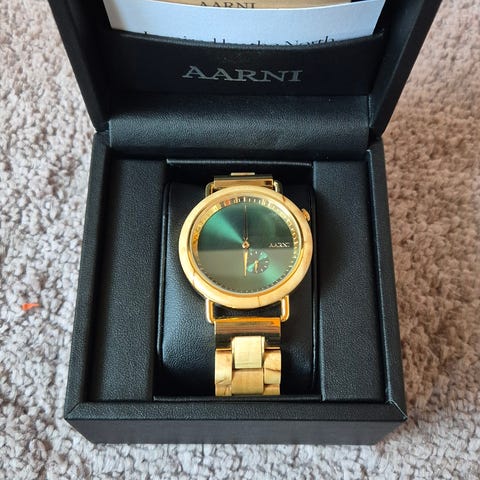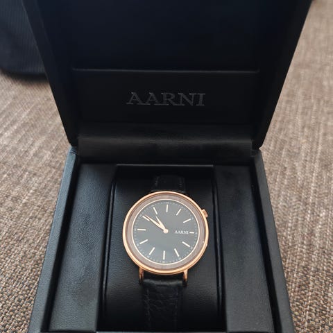 Myydään käytön puutteen vuoksi tyylikäs Aarni Loihi -rannekello, jossa pähkinäpuinen reunus.