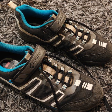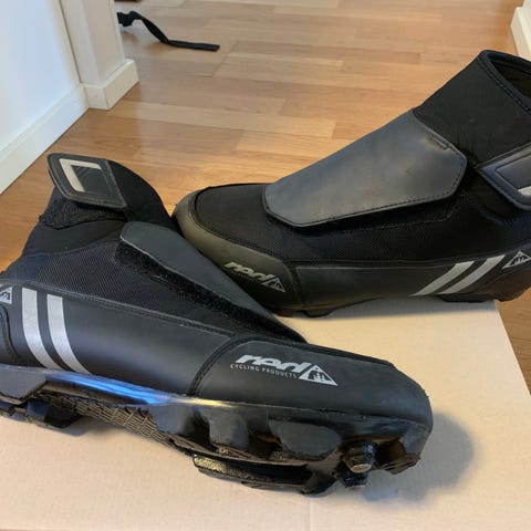 Shimano pyöräilykengät, koko 46. Väri musta valkoisin yksityiskohdin. Kengissä tarrakiinnitys kolmella remmillä. Pohjassa klossit poljinjärjestelmää varten. Soveltuvat pyöräilyyn, tarjoavat jäykän pohjan polkemiseen ja tuen jalalle. Koko ehkä lähempänä 44,5 kuin 46 kokoa.