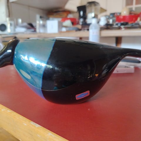 Design Oiva Toikan Variksen poika,jossa tummanvihreä ja musta sävy sekä kiiltävä, hieman hohtava pinta. Muoto on pyöristetty ja tyylitelty, ja esine on kokonaan lasia. Sopii esimerkiksi koriste-esineeksi hyllylle, ikkunalaudalle tai vitriiniin. Nuutajärvi