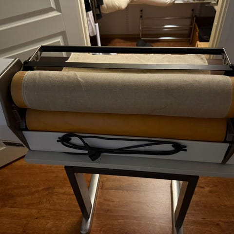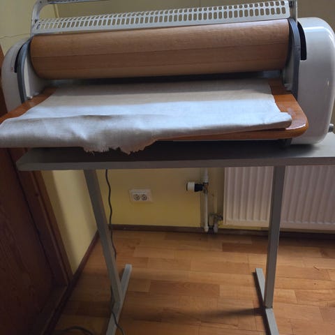 Harvinaisempi pieni siro mankeli. Toimii. Kauniisti kulunut. Metallia, puuta ja kumia. Painaa paljon, mutta yhden ihmisen helppo kuitenkin kantaa.