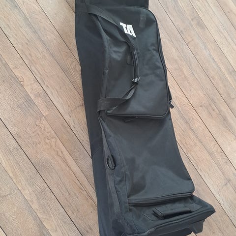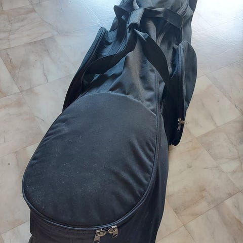 Musta muutaman kerran käytetty golfbägin kuljetuslaukku lentokoneeseen.