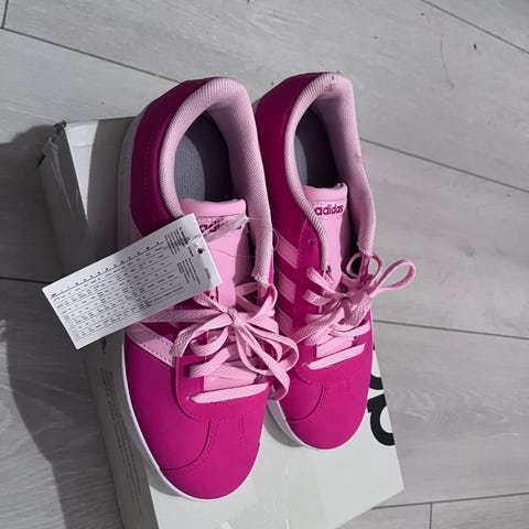 Adidas tennarit, koko 37. Väri pinkki, valkoiset raidat sivuilla. Nauhakiinnitys ja kumipohja. Soveltuvat arkikäyttöön ja vapaa-aikaan.