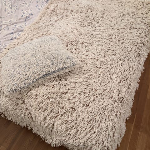 Sinisävyinen ja hyväkuntoinen peitto isoäidin neliöistä. Villalankaa. Lev. 155 cm ja pituus noin 185 cm. Yhdessä kohden neliöt hieman irronneet toisistaan, helppo korjata, tästä kuva.