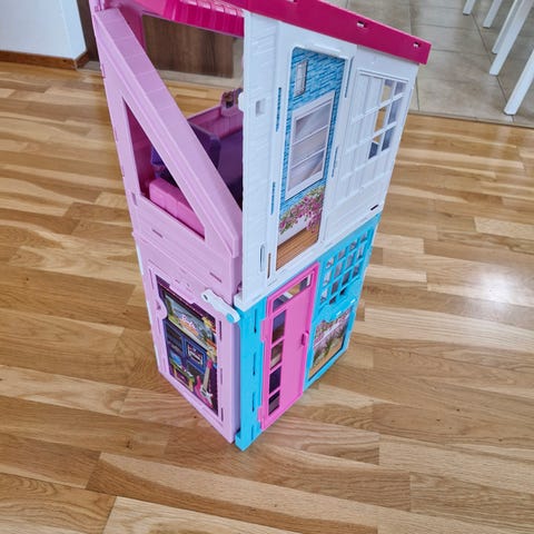 Hyväkuntoinen barbitalo seuraavalle leikkijälle. Mukana ostoskärry, koira ja pöytäjalkapallo. Vain nouto.