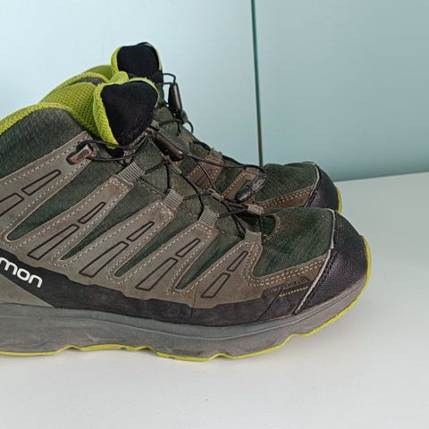Myydään siniset lasten vedenpitävät varrettomat Salomon Goretex vaelluskengät / retkeilykengät/ ulkoilukengät koossa 36. sisämitta n. 22cm. siistikuntoiset käytetyt ja ehjät välikausikengät. toisen kengän sisäpohjallisessa kantapään alla kulumajälki. pintalikaa paikoitellen, ei ole pesty. helppokäyttöiset pikanauhat.