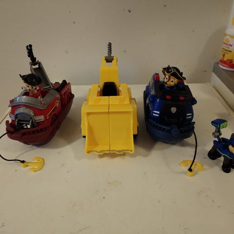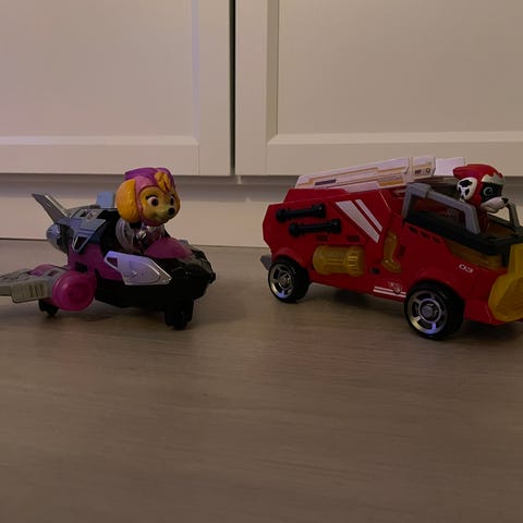 Monta pienempää Ryhmä Hau figuuria lisäksi isompi Samppa ja paloauto.