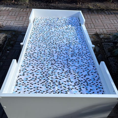 Sängyn runko on maalattua kalustelevyä ja pohja koivuvaneria. Kunto on siisti, mutta käytetty kuten kuvista näkyy.