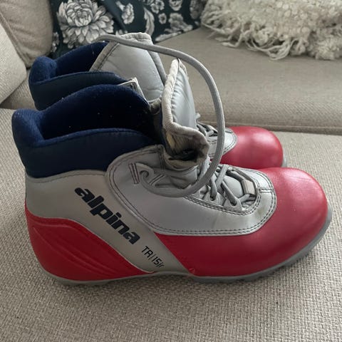 Alpina junior hiihtomonot. Väri sininen, harmaa ja punainen. Nauhakiinnitys ja korkea varsi, joka tukee nilkkaa. Käytetyt, mutta siistikuntoiset vielä seuraavalle.