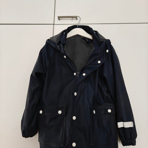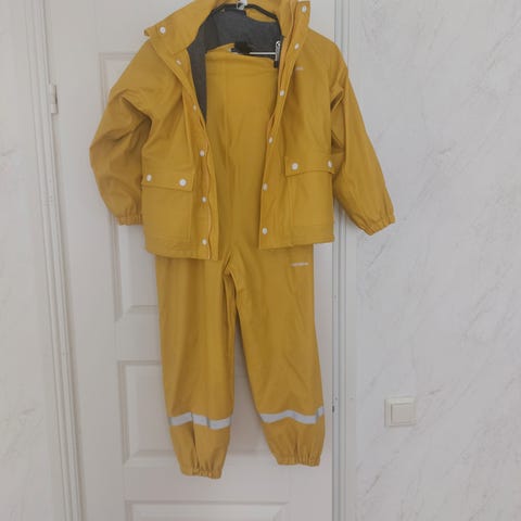 Tretorn lasten sadeasu, koko 128. Unisex-mallinen kaksiosainen sadeasu, jossa sininen takki ja biab-housut. Materiaalina vuoressa polyesteri ja ulkokankaassa polyuretaani. Takissa irrotettava huppu, painonappikiinnitys edessä ja etutaskut. Housuissa säädettävät henkselit. Asussa on heijastinyksityiskohtia. Soveltuu ulkoiluun sateisella säällä, ja sisävuoren ansiosta myös vähän kylmemmällä säällä.