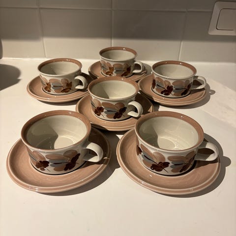Myydään kaunis ja hyväkuntoinen Arabia Koralli -astiasto. Muuten osat ehjiä, ei halkeamia tai lohkeamia, yhden kahvikupin korva on kiinnitetty joskus uudelleen. Muissa vähäistä käytön jälkeä.